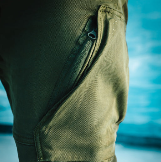 • man wearing grey waterproof pants walking into frame, zipping the thigh pocket, adjusting the snap cuff, and stretching the thigh fabric